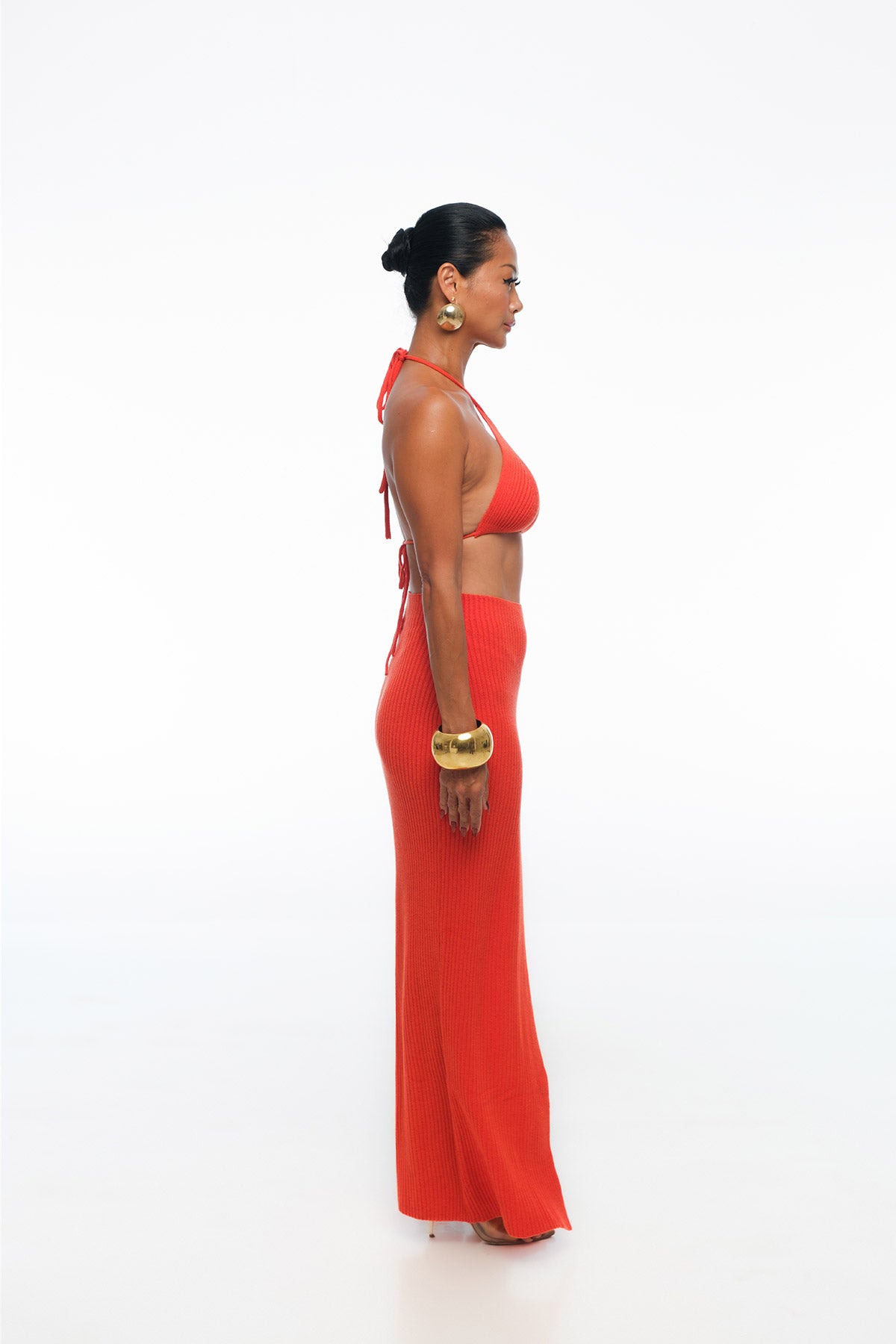 Radiate confidence in this sexy ensemble featuring a knitted bikini top paired with a flowing long skirt in a stunning orange sunset hue. Perfect for beachside soirées or golden hour getaways, it captures the warmth and allure of tropical evenings..